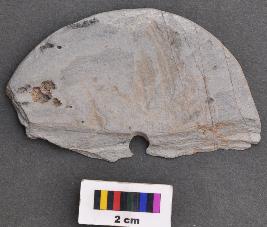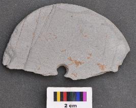 | Description / विवरण | It is a perforated disc, with thin section and grind edge. It may have been used as toy wheel. Its half portion is missing. On one of its surfaces thin zig-zag lines are engraved, which betray sun motif. |