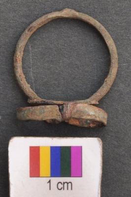 | Description / विवरण | It is finger ring prepared of a thick sheet of copper with flattened top. With the flattened top was attached an English digit 8 shaped figure prepared out out of a thin sheet of copper. |