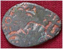 | Description / विवरण | The coin is an imperial type of Punch- marked coin. The shape of the coin is oval. Obverse Sun, nandipada, six armed wheel, taurines and other two symbols are indistinct. Reverse Some indistinct symbols. |