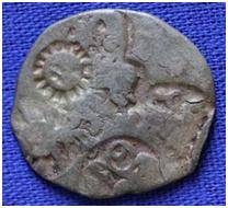 | Description / विवरण | The coin is an imperial type of Punch- marked coin. The shape of the coin is circular. Obverse Sun, six armed wheel, six arched hill, animal, taurine and some indistinct symbols. Reverse Six-armed wheel, tree, insect and some indistinct symbols. |
