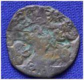 | Description / विवरण | The coin is an imperial type of Punch- marked coin. The shape of the coin is circular. Obverse Two Sun, six armed wheel, caduceus and some indistinct symbols due to abrasion. Reverse Nandipada, six armed wheel and some indistinct symbols due to abrasion. |