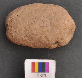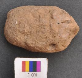 | Description / विवरण | It is an oblong object pinched at one end. It has a perforation close to pinching area and there is a small groove close to the pinching. Thus all these three features give an impression of a figurine. Besides, there is a small depression at the base too. |