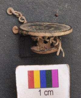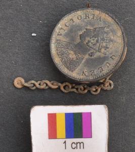 | Description / विवरण | It appers to be button of coat or jerkin to which is attached a thin chain. The obverse of the button reads Queen Victoria with depiction of queen. |