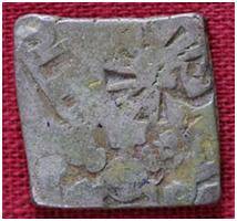 | Description / विवरण | The coin is an imperial type of Punch- marked coin. The shape of the coin is square. Obverse Sun, six armed wheel, three arched gate and an indistinct symbol. Reverse Insect. |