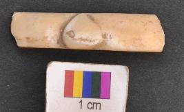 | Description / विवरण | It is a fragment of shell bangle with a closed bracket type decoration on the external surface and triangular section. |