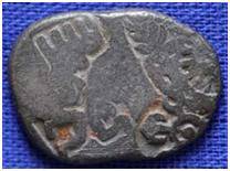 | Description / विवरण | he shape of the coin is irregular. Obverse A Sun, six armed wheel, humped bull, leafless tree in a railing of four square and a human figure. Reverse Tree. |