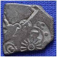 | Description / विवरण | The shape of the coin is hexagonal. Obverse A Sun, six armed wheel, animal, taurine, dot, dog topped five arched hill and some indistinct symbols. Reverse Crescent and two indistinct symbols. |