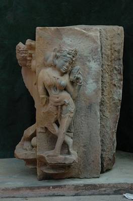 | Description / विवरण | Fragment of a temple wall showing on front face a women admiring herself in a mirror. Right hand and leg damaged, Nose also injured. On the left side is the badly damaged figure of a women playing with a ball. |