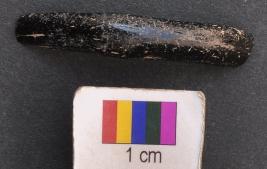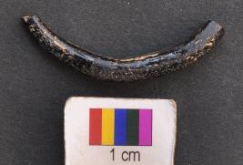 | Description / विवरण | It is fragment of a black glass bangle with flat inner face and round outer one. It is angular imprssions on the inner face indicating twisting. |