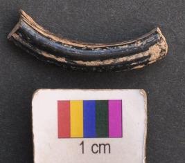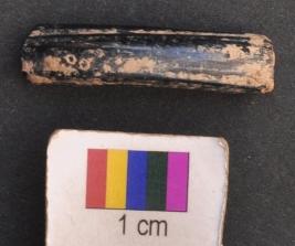 | Description / विवरण | It is fragment of a black glass bangle with flat inner face and round outer one. It has a prominent grooved line on one of the dorsal part. |