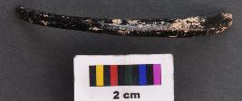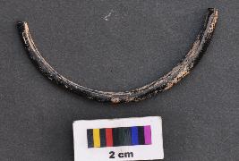 | Description / विवरण | It is fragment of a black glass bangle with flat inner face and round outer one. It has uneven thickness. |
