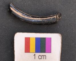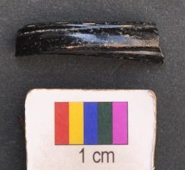 | Description / विवरण | It is fragment of a black glass bangle with flat inner face and round outer one. It has uneven thickness and grooved decoration all along the body |