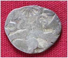 | Description / विवरण | The coin is an imperial type Punch- marked Coin. The shape of the coin is oval. Obverse Sun, animal, three arched hill, six armed chakra and other symbols are indistinct. Reverse Crescent topped three arched hill. |