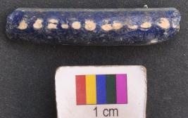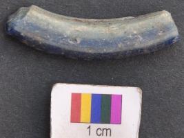 | Description / विवरण | It is fragment of a blue glass bangle with flat inner face and round outer. Its inner face is light bluish. It has blunt ridge on the external face which is decorated with white dots prepared in depression. It has thick section. |
