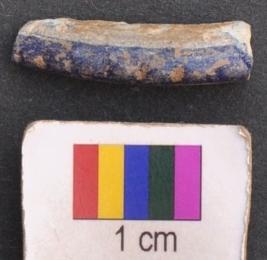 | Description / विवरण | It is fragment of a glass bangle with triangular section and flat inner face. The inner face including the core is whitish whereas the outer face is dark bluish. On the outer surface is segmented design. |