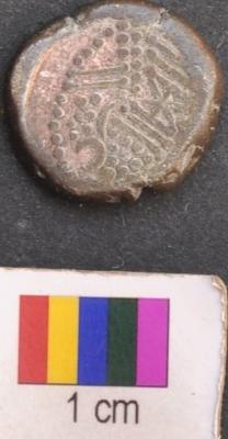 | Description / विवरण | It is a silver coin.There is a star like motif above and below of which is a set of three parallel lines ending with dots. There is a set of dots arranged in parallel lines on either left and right side of the star eventually forming a triangle around the star. The set of parallel line above the star is kept in a bracket above which is a also a set of dots and a moon symbol. There a set of two parallel sided slanting lines on the left and right side of the said triangles. Finally a dotted line encircles all these features. On the other side, a motif is depicted which looks like a human figure surrounded dotted line. There is slanting line attached to its bust and there is half circle and dot inside below this human motif. |