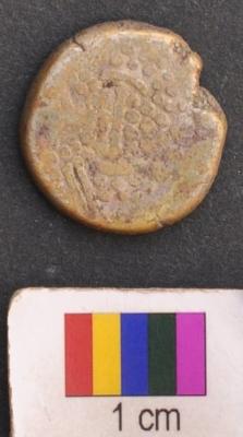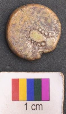 | Description / विवरण | It is a silver coin.There is a star like motif above and below of which is a set of three parallel lines ending with dots. There is a set of dots arranged in parallel lines on either left and right side of the star eventually forming a triangle around the star. The set of parallel line above the star are kept in a bracket above which is a also a set of dots and a moon symbol. There a set of two parallel sided slanting lines on the left and right side of the said triangles. Finally a dotted line encircles all these features. On the other side, a motif is depicted which looks like a human figure surrounded by a tree type symbol prepared by small parallel lines and dots. It is finally flanked on top by serpent motif. The head of human figure is also encircled by dotted lines. |