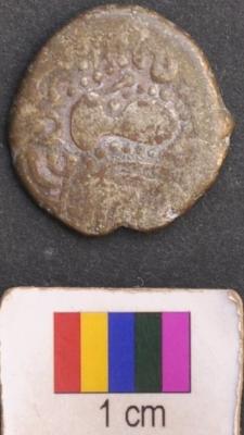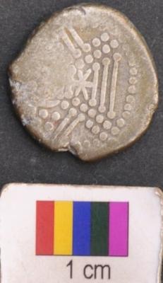 | Description / विवरण | It is a silver coin.There is a star like motif above and below of which is a set of three parallel lines ending with dots. There is a set of dots arranged in parallel lines on either left and right side of the star eventually forming a triangle around the star. The set of parallel line above the star are kept in a bracket above which is a also a set of dots and a moon symbol. There a set of two parallel sided slanting lines on the left and right side of the said triangles. Finally a dotted line encircles all these features. On the other side, a motif is depicted which looks like a human figure surrounded by a tree type symbol prepared by small parallel lines and dots. It is finally flanked on top by serpent motif. The head of human figure is also encircled by dotted lines. |