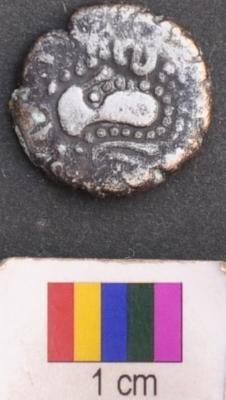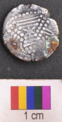 | Description / विवरण | It is a silver coin.There is a star like motif above and below of which is a set of three parallel lines ending with dots. There is a set of dots arranged in parallel lines on either left and right side of the star eventually forming a triangle around the star. The set of parallel line above the star are kept in a bracket above which is a also a set of dots and a moon symbol. There a set of two parallel sided slanting lines on the left and right side of the said triangles. Finally a dotted line encircles all these features. On the other side, a motif is depicted which looks like a human figure surrounded by a tree type symbol prepared by small parallel lines and dots. It is finally flanked on top by serpent motif. The head of human figure is also encircled by dotted lines. |