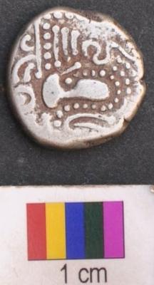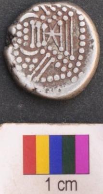 | Description / विवरण | It is a silver coin.There is a star like motif above and below of which is a set of three parallel lines ending with dots. There is a set of dots arranged in parallel lines on either left and right side of the star eventually forming a triangle around the star. The set of parallel line above the star are kept in a bracket above which is a also a set of dots and a moon symbol. There a set of two parallel sided slanting lines on the left and right side of the said triangles. Finally a dotted line encircles all these features. On the other side, a motif is depicted which looks like a human figure surrounded by a tree type symbol prepared by small parallel lines and dots. It is finally flanked on top by serpent motif. The head of human figure is also encircled by dotted lines. |