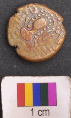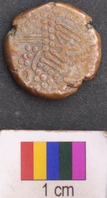 | Description / विवरण | It is a silver coin.There is a star like motif above and below of which is a set of three parallel lines ending with dots. There is a set of dots arranged in parallel lines on either left and right side of the star eventually forming a triangle around the star. The set of parallel line above the star are kept in a bracket above which is a also a set of dots and a moon symbol. There a set of two parallel sided slanting lines on the left and right side of the said triangles. Finally a dotted line encircles all these features. On the other side, a motif is depicted which looks like a human figure surrounded dotted line. |