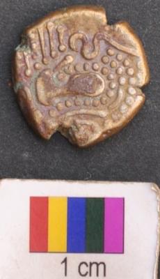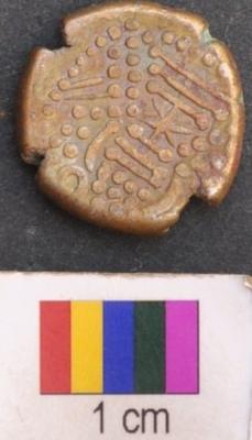 | Description / विवरण | It is a silver coin.There is a star like motif above and below of which is a set of three parallel lines ending with dots. There is a set of dots arranged in parallel lines on either left and right side of the star eventually forming a triangle around the star. The set of parallel line above the star are kept in a bracket above which is a also a set of dots and a moon symbol, besides a vertical line in the central top part. There a set of two parallel sided slanting lines on the left and right side of the said triangles. Finally a dotted line encircles all these features. All these feature appear to be representation of a mosque. On the other side, a motif is depicted which looks like a human figure surrounded dotted line. Its edge is slightly broken. |
