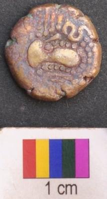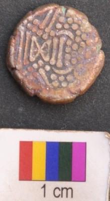 | Description / विवरण | It is a silver coin.There is a star like motif above and below of which is a set of three parallel lines ending with dots. There is a set of dots arranged in parallel lines on either left and right side of the star eventually forming a triangle around the star. The set of parallel line above the star is kept in a bracket above which is a also a set of dots and a moon symbol. There a set of two parallel sided slanting lines on the left and right side of the said triangles. Finally a dotted line encircles all these features. On the other side, a motif is depicted which looks like a human figure surrounded dotted line. There is slanting line attached to its bust and there is half circle and dot inside below this human motif. |