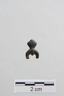 | Description / विवरण | Two different portions are noticeable in object. Cone shaped knob in top and below two semi circular flank . These two portions are joined together with narrow neck. There is small node in middle of the semi circular curve. |