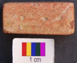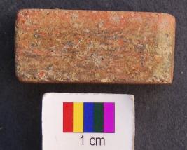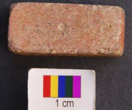| Description / विवरण | It is a cuboid terracotta dice in which engraved miniscule depressions are made on the longer axis. One the first facet there is only one depression, on the second two, one the third three and on the fourth facet four depressions are made. It was perhaps used as dice. It has polished surface. |