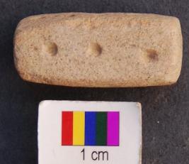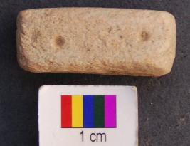 | Description / विवरण | It is a cuboid terracotta dice in which engraved miniscule depressions are made on the longer axis. One the first facet there is only one depression, on the second two, one the third three and on the fourth facet four depressions are made. The depressions are quite prominent and it was perhaps used as a dice. |