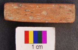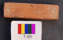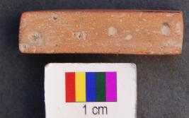 | Description / विवरण | It is a cuboid terracotta dice in which miniscule depressions are engraved on the longer axis. It is relatively longer in size compared to others in collection. The depressions are hardly visible. On the first facet there is only one depression, on the second two, on the third three and on the fourth facet four depressions are made. It was perhaps used as a dice. It has polished surface. |