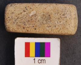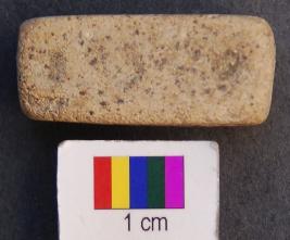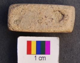 | Description / विवरण | It is a cuboid terracotta dice in which miniscule depressions are engraved on the longer axis. On the first facet there is only one depression, on the second two, on the third three and on the fourth facet four depressions are made. The depressions are quite prominent. It was perhaps used as a dice. |
