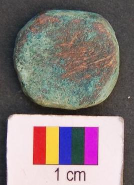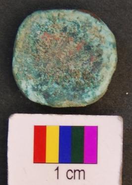 | Description / विवरण | It has a motif on one side but due to leaching out of copper sulphate it is difficult to identify. |