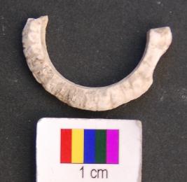 | Description / विवरण | It is a fragment of a shell ring with a mid rib on the outer face. Both facets of outer face are decorated with grooved parallel vertical lines. On one end there is a small oval shape depression on the outer face. |