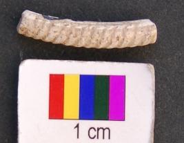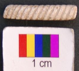 | Description / विवरण | It is a fragment of a shell bangle with almost circular body. The outer face is decorated with a series of slanting parallel grooved lines which look like forming a rope design. |
