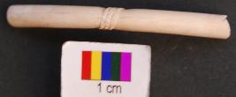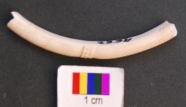 | Description / विवरण | It is a fragment of a shell bangle with round body and faceted inner face. On the outer face is a set of three slanting parallel low ridges. |