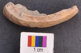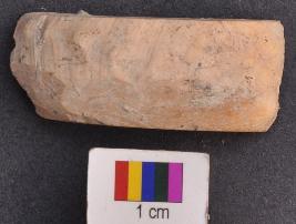 | Description / विवरण | It is perhaps fragment of a shell bangle with wide face. There is mid rib on the external face. |
