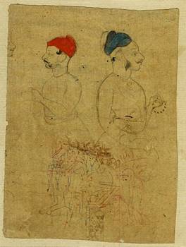 | Description / विवरण | Picture shows two persons standing back to back to each other. One stands with folded hands while the other one holds a rosary in one of his hands. One man wear a blue turban and the other red one. On the reverse. There is the picture of a building. Line drawing. |
