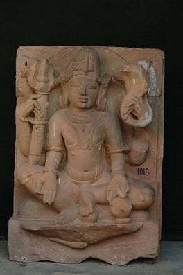 | Description / विवरण | Fragment of temple wall showing figure of four armed god Siva seated in ardhaparyankasanmudra on a cushion. The lower right hand is in varadamudra and the other hands hold a trident a snake and a pot. |