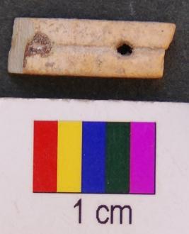 | Description / विवरण | It is a fragment of an ivory bangle with rectangular section. On its outer face is a grooved line running all along the body. There are perforations on the body at certain distance. |