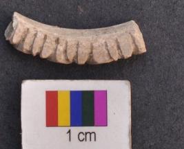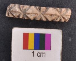 | Description / विवरण | It is fragment of a shell bangle with facetted body and decorated with engraved star like patterns all around the external face. The grooved lines of star pattern extend to the dorsal parts of the body eventually giving an impressive parallel set of lines all along the body. |