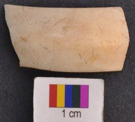 | Description / विवरण | It is fragment of a shell bangle with wide facetted body and triangular section. It has prominent mid rib on the external surface. |