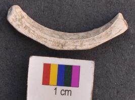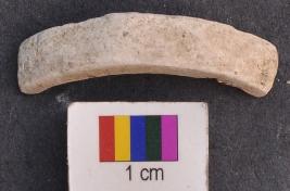 | Description / विवरण | It is a small fragment of a shell bangle with facets. It is weathered and leaves white colour while rubbing. |