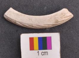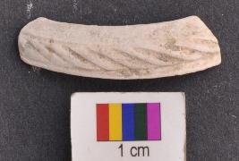 | Description / विवरण | It is fragment of a shell bangle with facetted body and triangular section. The outer face is decorated with set of slanting grooved parallel lines. |