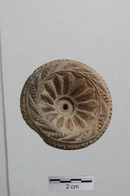 | Description / विवरण | Mould made inverted conical shape with flat base for standing. Inner portion is intricately designed. There is circle of petal motif just above the hollow. Above this another circle leaf motifs covering the upper portion. Outer portion of rim is decorated with criss cross motif. Opposite portion does not contain any design |