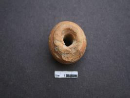 | Description / विवरण | Terracotta ghatshaped bead, chipped off surface |