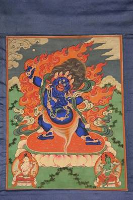 | Description / विवरण | Characterized by a grey mount, this painting represents the tantric manifestation of the thunderbolt-bearer Vajrapani, two-legged and two-armed, clad in blue with the thunderbolt, in his raised right hand. |