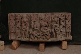 | Description / विवरण | The main group is flanked by rampant vyalas stepping on elephants, and conventional niches with tall udgamas formed by three indusalikas. In the center is Siva supporting Parvati on his lap. Below them are the bull and lion vahanas with dancing Bhrngi between. The arms, the heads, and the portion above are badly damaged. In addition to the small attendants immediately next to them, are large figures of female cauri-bearers whose heads have also been broken off. They stand in graceful swaying postures, their bodies gently turned toward the divine couple. Their long dhoti reach almost to the ankles and are marked by gentle ridges to indicate the folds. Each is accompanied by a female attendant carrying a bag. The jewelry consists mainly of beaded necklaces and girdles. |