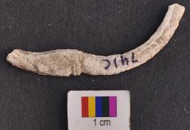 | Description / विवरण | It is fragment of a shell bangle with facetted dorsals. On the outer surface is executed a set of parallel ridges. It is weathered and gives white powdered material while rubbing. |