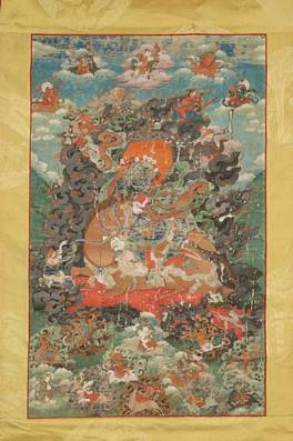 | Description / विवरण | Characterized of golden colour Chinese silk mount, the painting features the tantric manifestation of Shri Devi, the great Protectress of Religion. She is recognised by her parasol of peacock feathers shining above her flaming hair. |